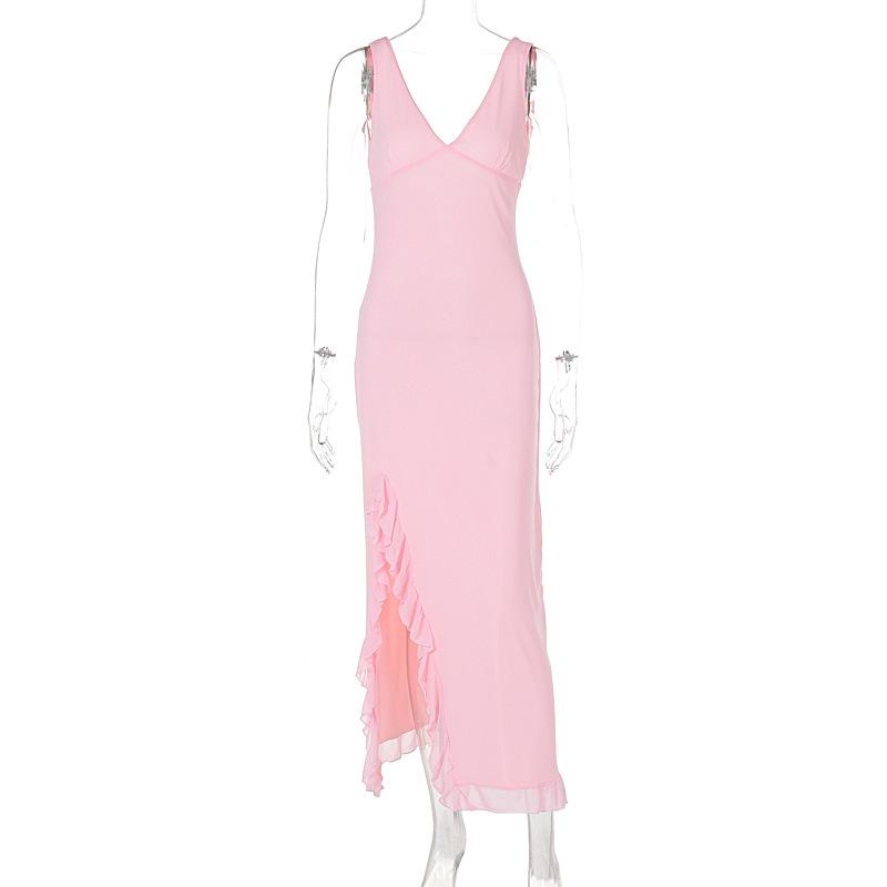 Женское розовое макси-платье с оборками, V-образным вырезом, без рукавов, длинное летнее платье с открытой спиной, элегантное пляжное платье для вечеринки S