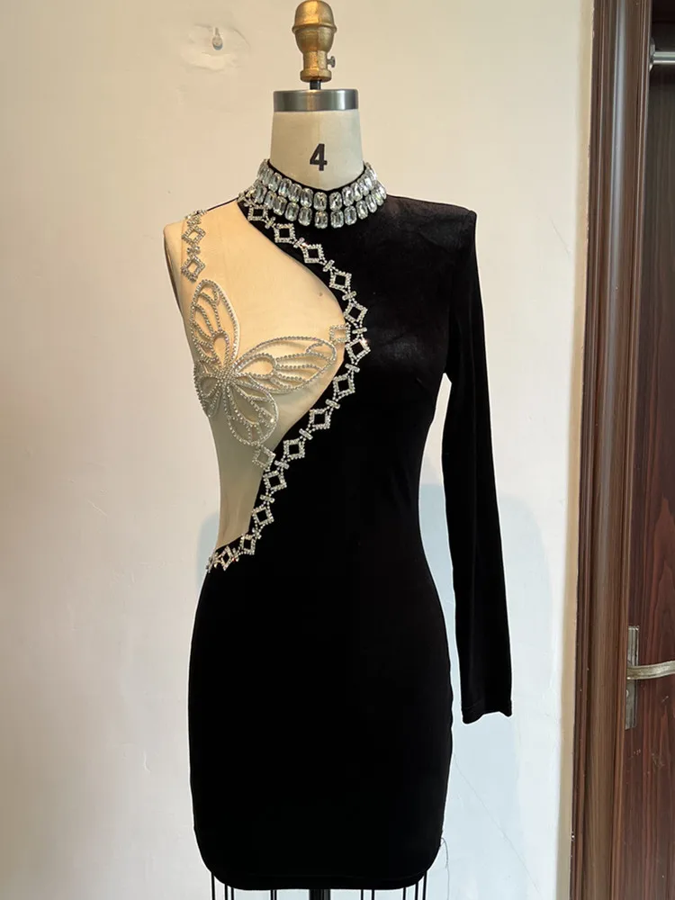 Женское роскошное сексуальное платье с длинным рукавом и воротником-хомутом, облегающее Черное мини-платье со стразами, элегантное вечернее платье