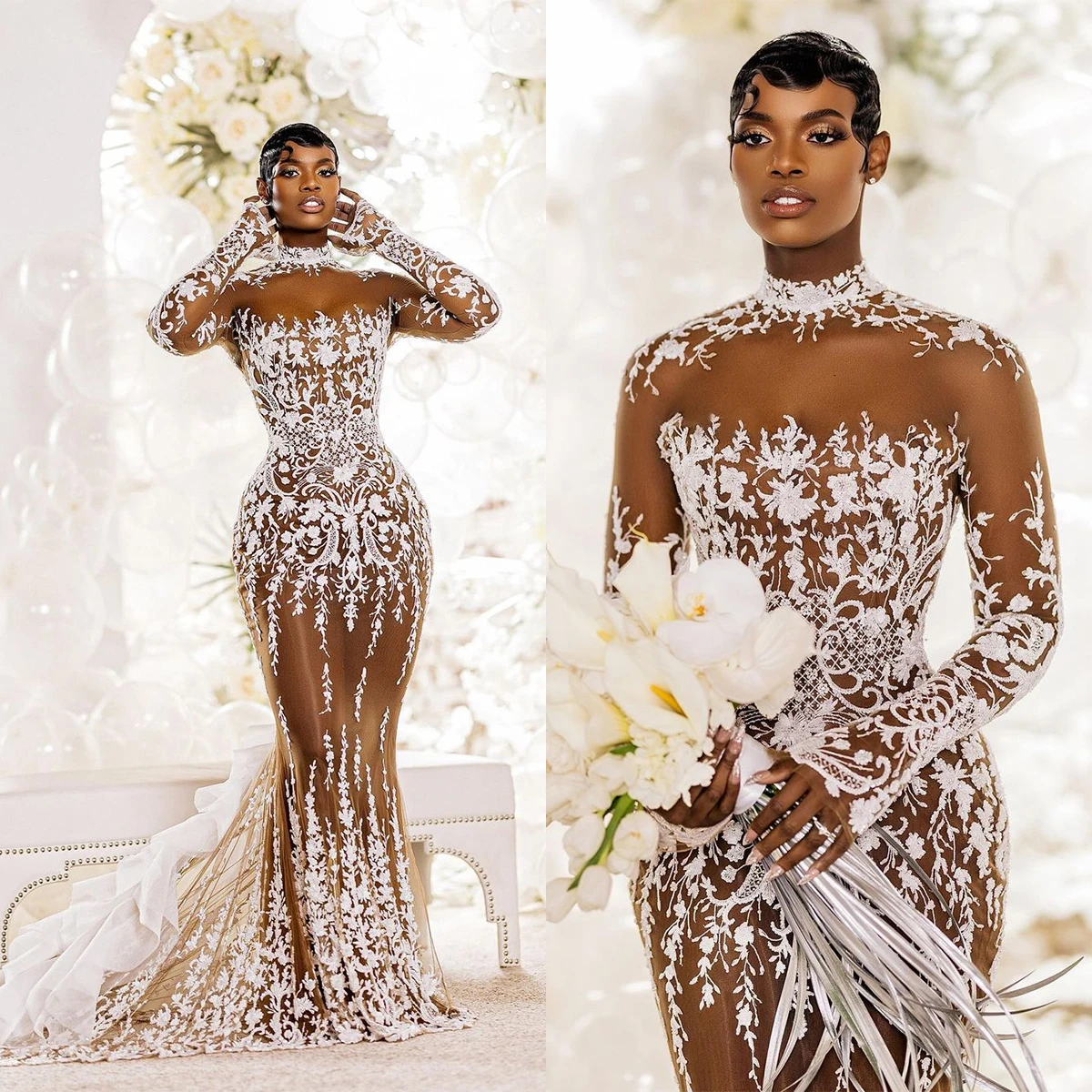 Женское свадебное платье-Русалка, стильное платье невесты с высоким воротником, индивидуальный пошив