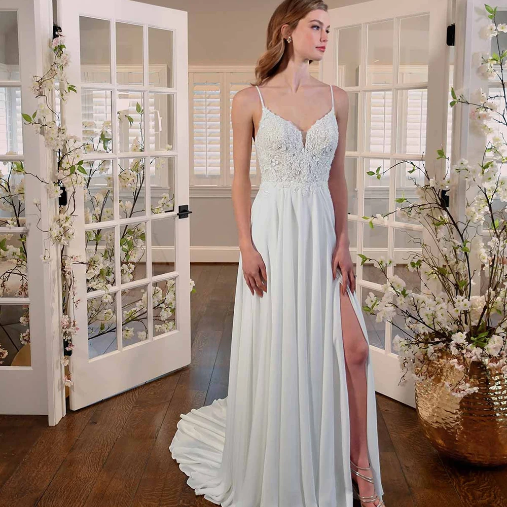 Женское свадебное платье в стиле бохо, шифоновое платье с квадратным вырезом, без рукавов, на тонких бретельках, с открытой спиной, со шлейфо...
