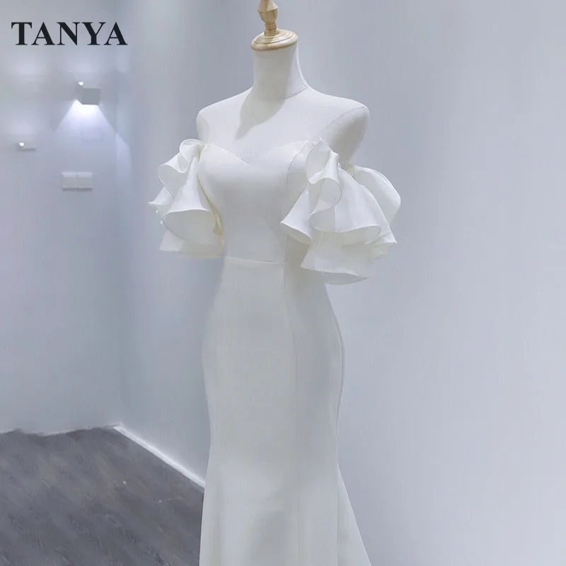 Женское свадебное платье с юбкой-годе, элегантное простое Сдержанное платье невесты с открытыми плечами и бантом на спине, SWD165