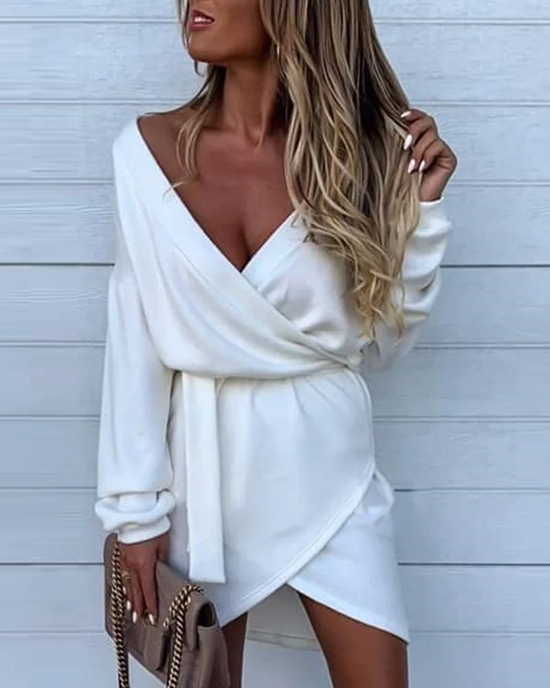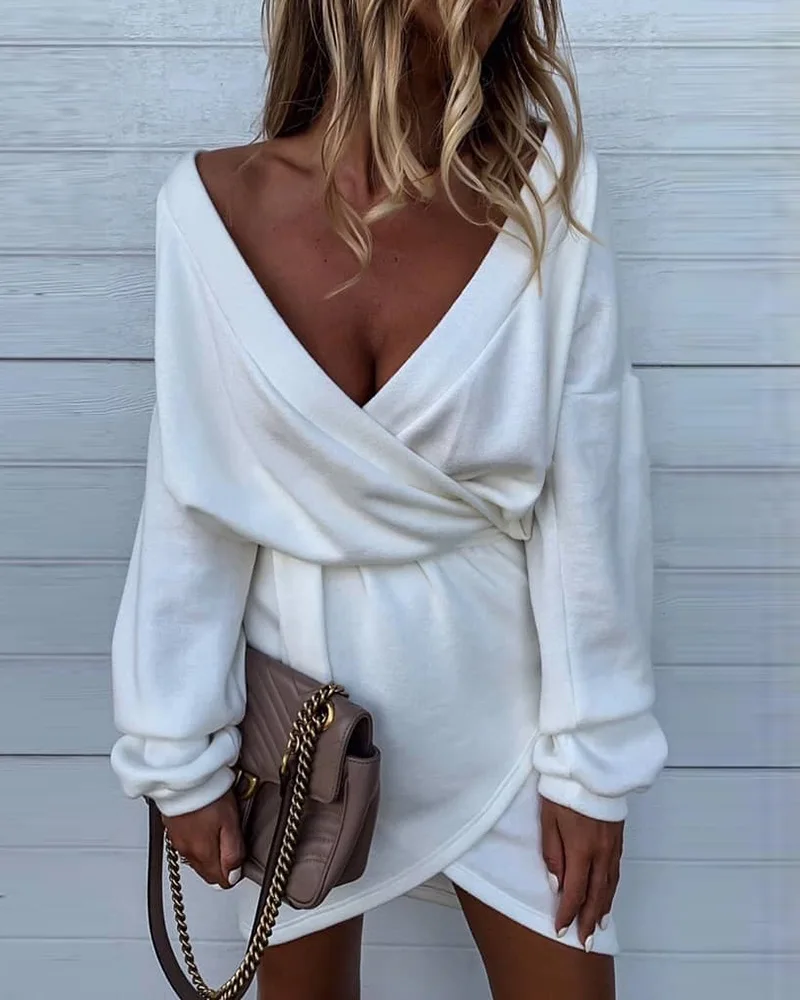 Женское свободное мини-платье с V-образным вырезом, длинным рукавом
