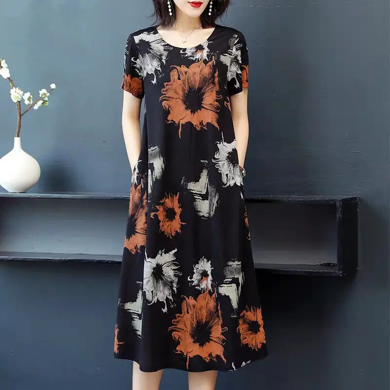 Женское свободное платье из вискозы, летнее платье среднего возраста с цветочным принтом и коротким рукавом, 2022