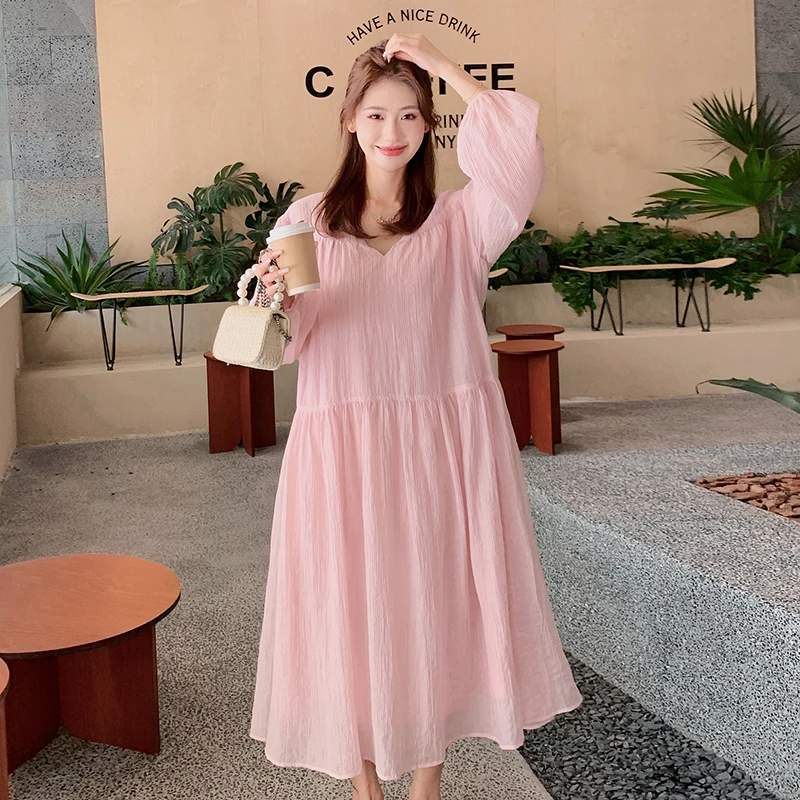 Женское свободное платье макси с длинными рукавами-фонариками и V-образным вырезом