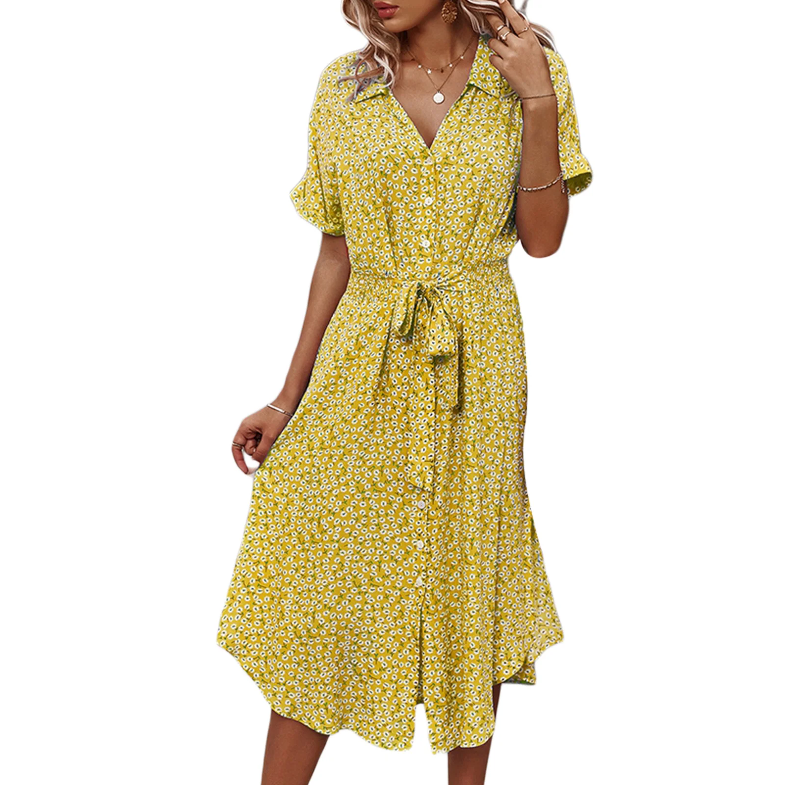 Женское свободное платье на пуговицах, с коротким рукавом и поясом спереди