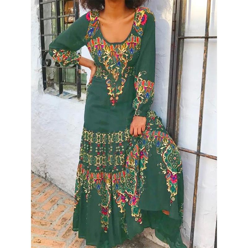Женское свободное платье с круглым вырезом, винтажное повседневное платье макси с длинным рукавом и принтом, элегантное женское пляжное платье, богемное вечерние клубное платье 3XL армия зеленый