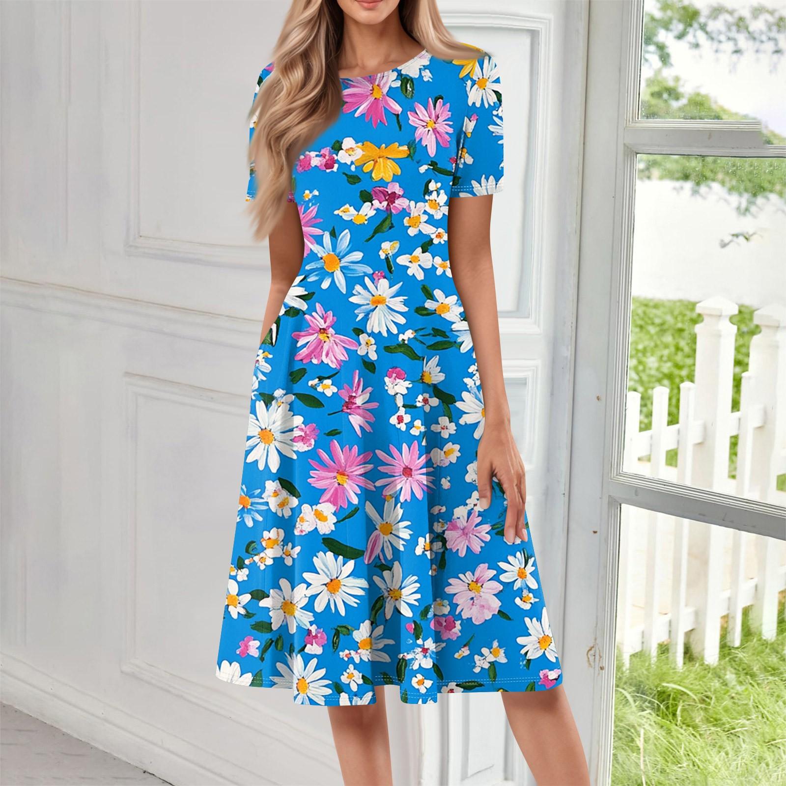 Женское свободное повседневное и модное платье с круглым вырезом и короткими рукавами, средней длины с принтом XL небесно-голубой
