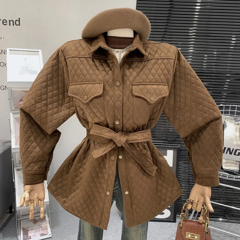 Женское свободное приталенное пальто на шнуровке с длинным рукавом