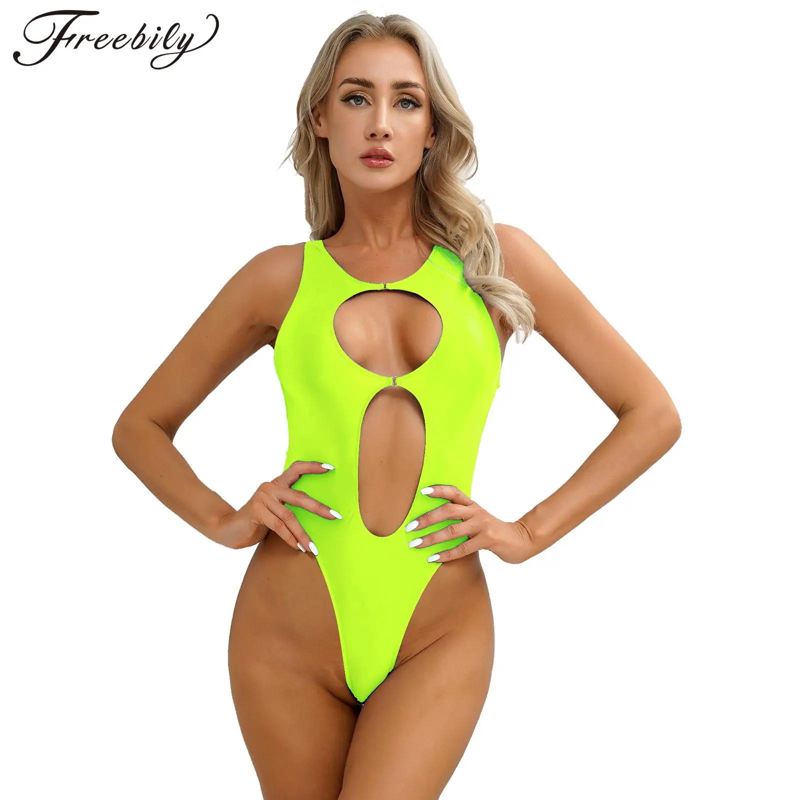 Женское сексуальное глянцевое боди, купальник без рукавов, с высоким вырезом, трико, женский купальник