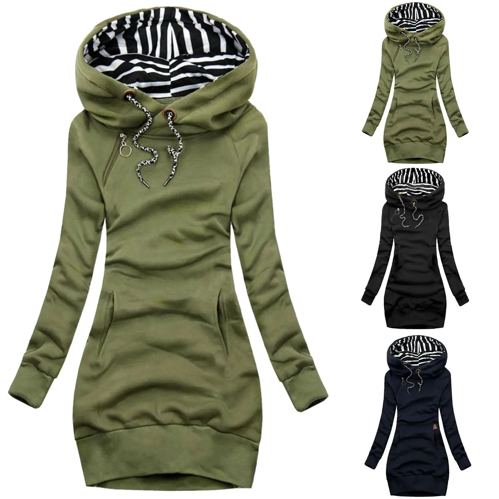 Женское теплое пальто с капюшоном, осенняя толстовка средней длины с полосками и длинными рукавами, с капюшоном, пуловер с капюшоном