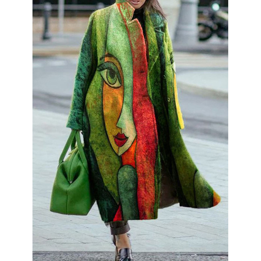 women tops,женское толстое шерстяное пальто средней длины в стиле ретро с абстрактным принтом