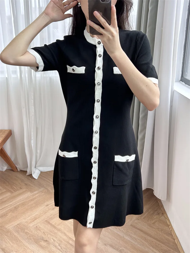 Женское трикотажное платье мини, черное однобортное элегантное платье составного кроя с круглым вырезом и коротким рукавом, лето 2024