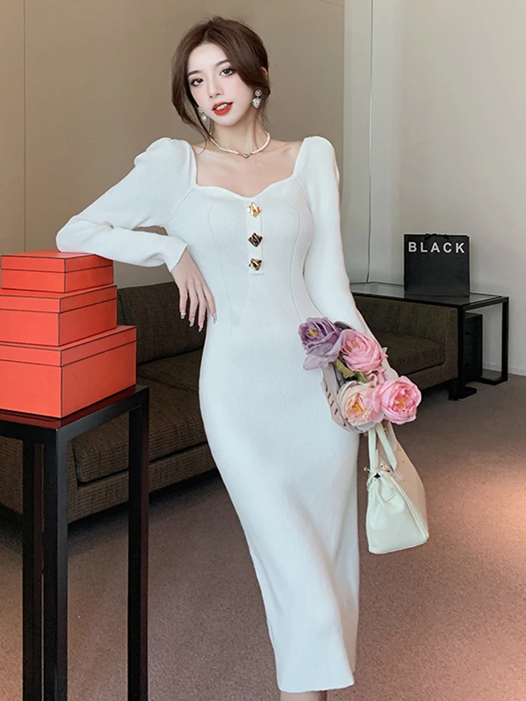 Женское трикотажное платье-свитер на пуговицах, с квадратным вырезом