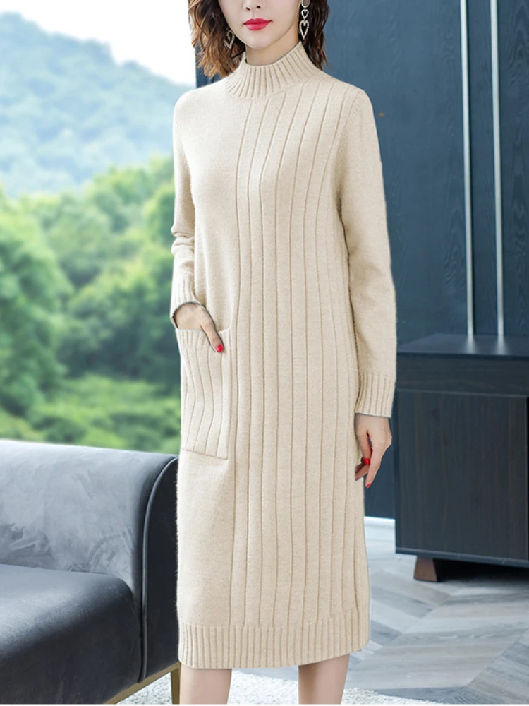 Женское трикотажное платье-свитер средней длины, с высоким воротником