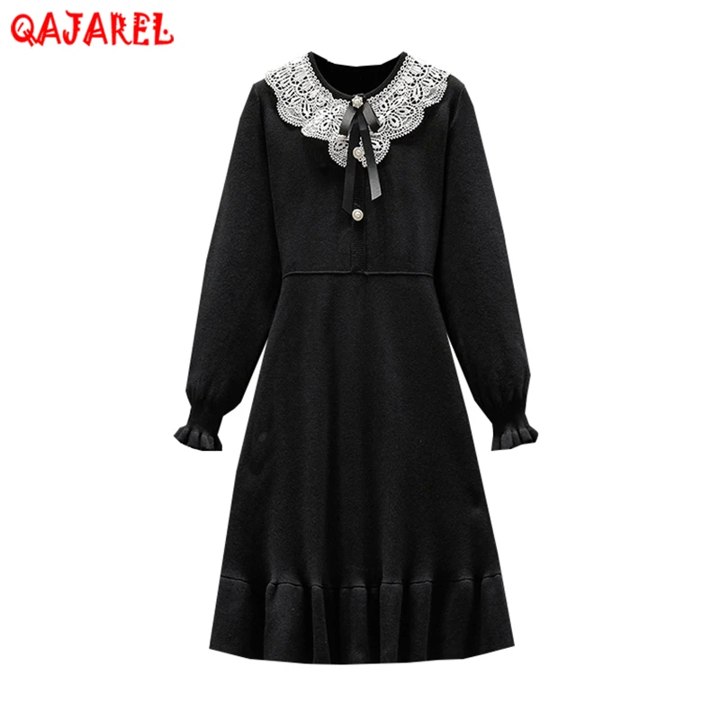 Женское трикотажное платье-свитер средней длины, черное повседневное теплое трикотажное платье с кружевным воротником в Корейском стиле, Осень-зима 2023
