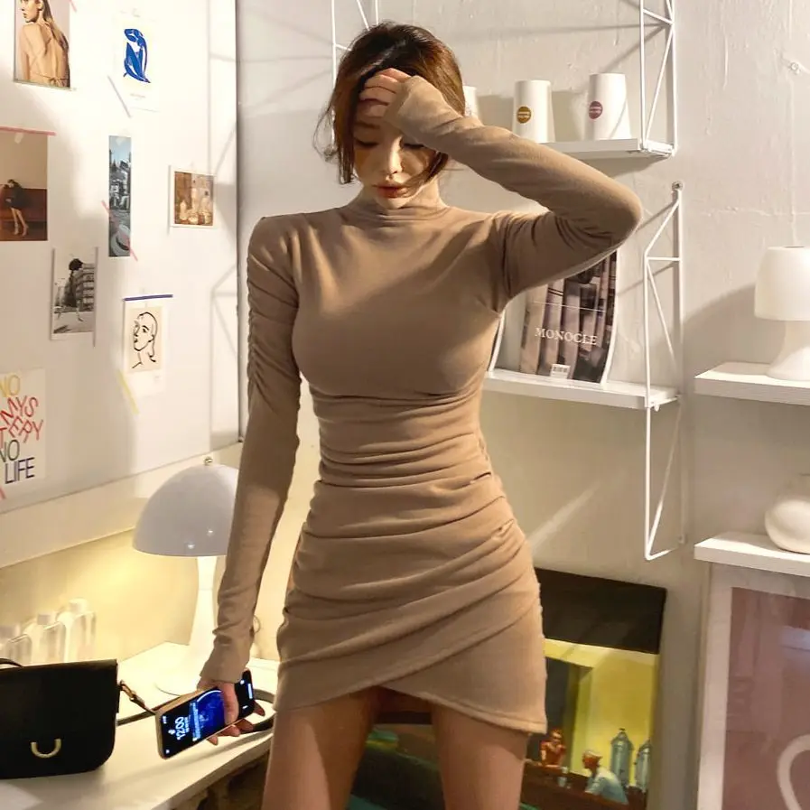 Женское трикотажное платье-свитер с высоким воротником и длинным рукавом