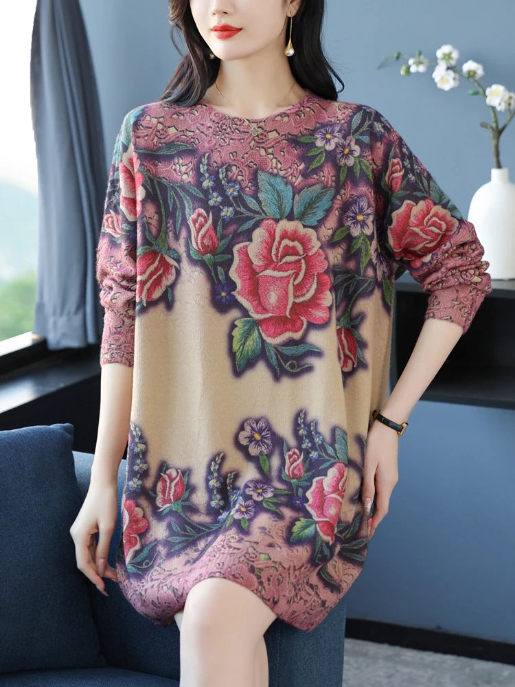 Женское трикотажное платье-свитер с цветочным принтом