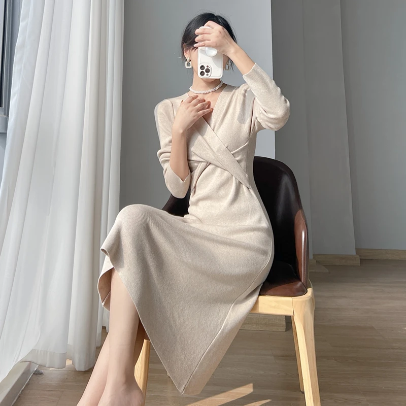 Женское трикотажное платье-свитер с V-образным вырезом и длинным рукавом