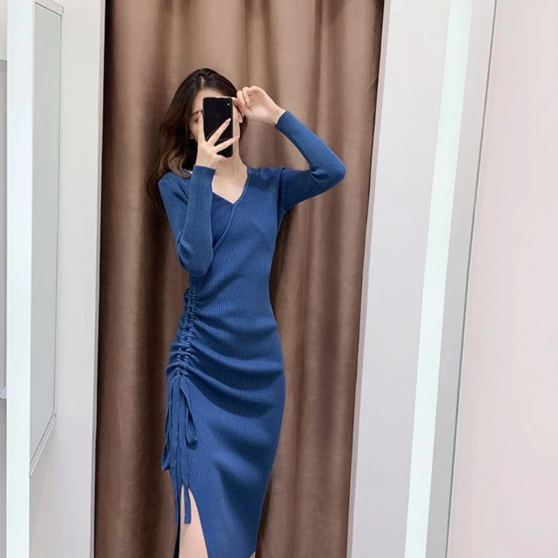 Женское трикотажное платье средней длины, с V-образным вырезом