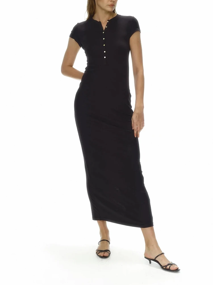 Женское трикотажное платье с коротким рукавом, универсальное однотонное длинное платье с облегающим поясом и разрезом, Новинка лета 2024