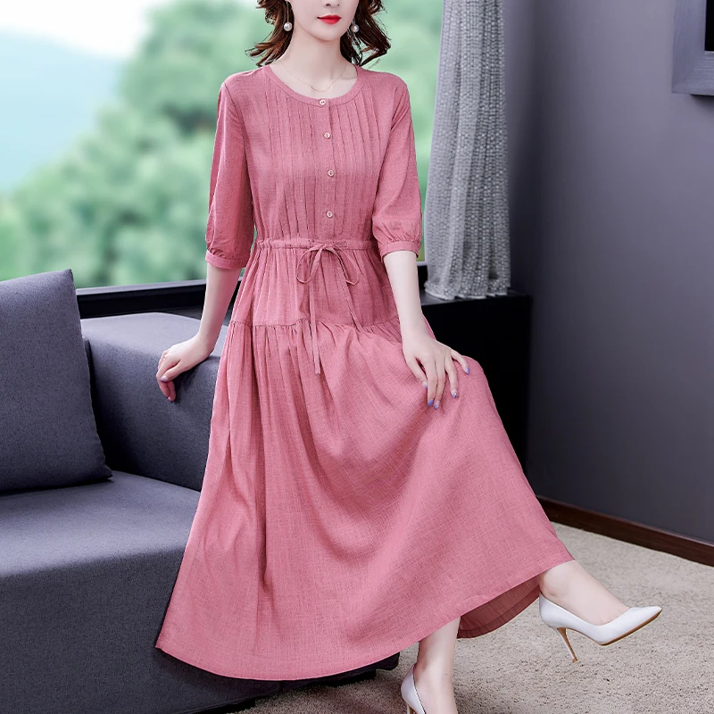 Женское хлопковое платье средней длины, розовое повседневное облегающее однотонное платье-трапеция в Корейском стиле, весна-осень 2024