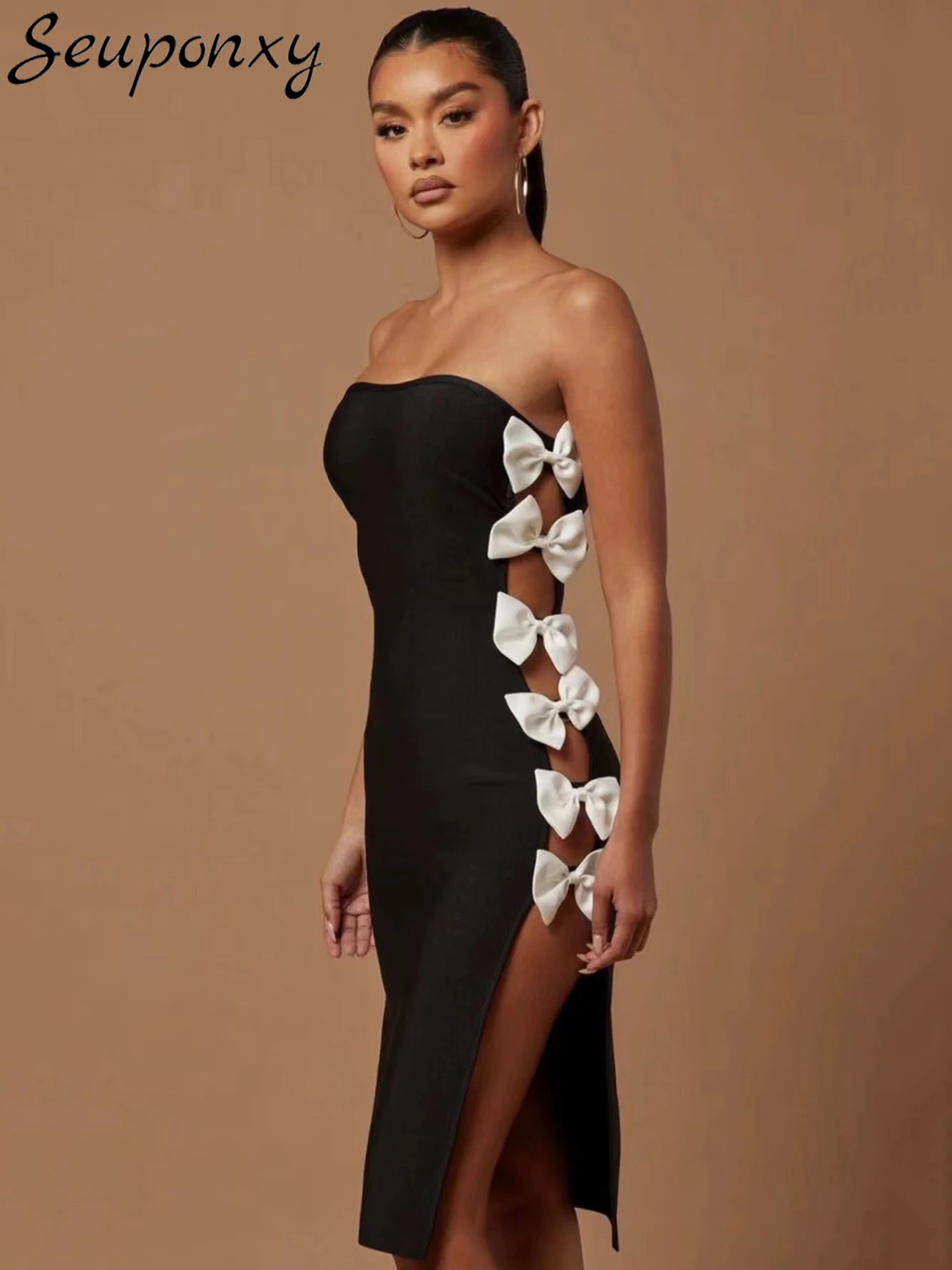 Женское черное Бандажное платье высокого качества, привлекательное вечернее платье без бретелек, с открытой спиной и 3D цветами, с вырезами, в стиле знаменитостей, 2024