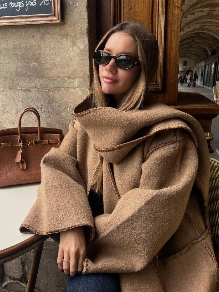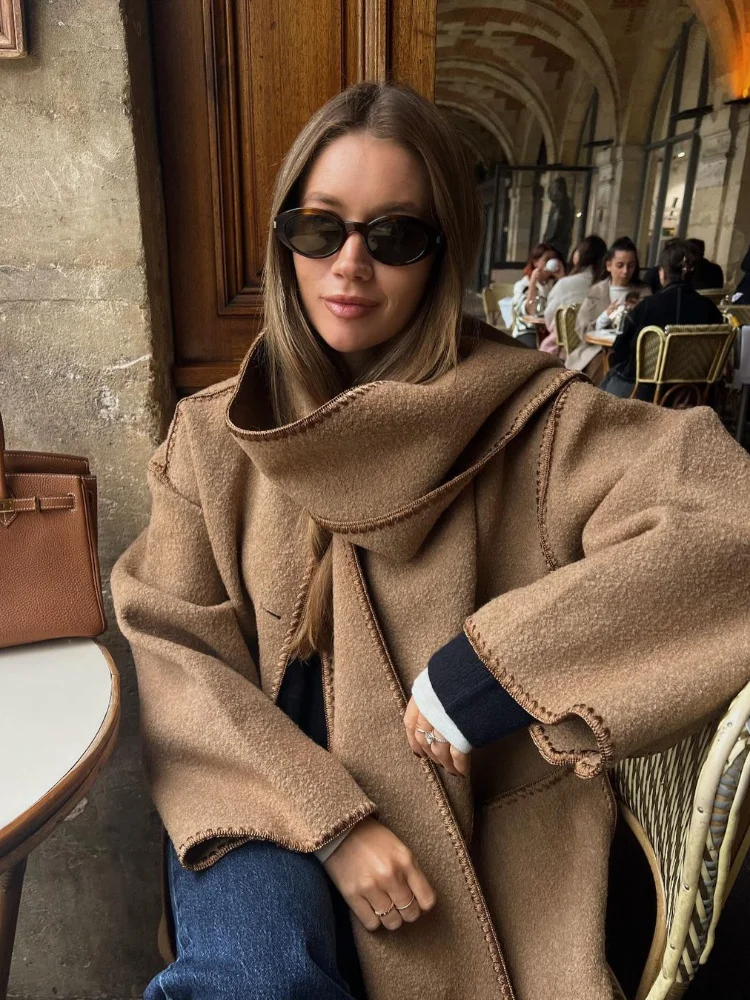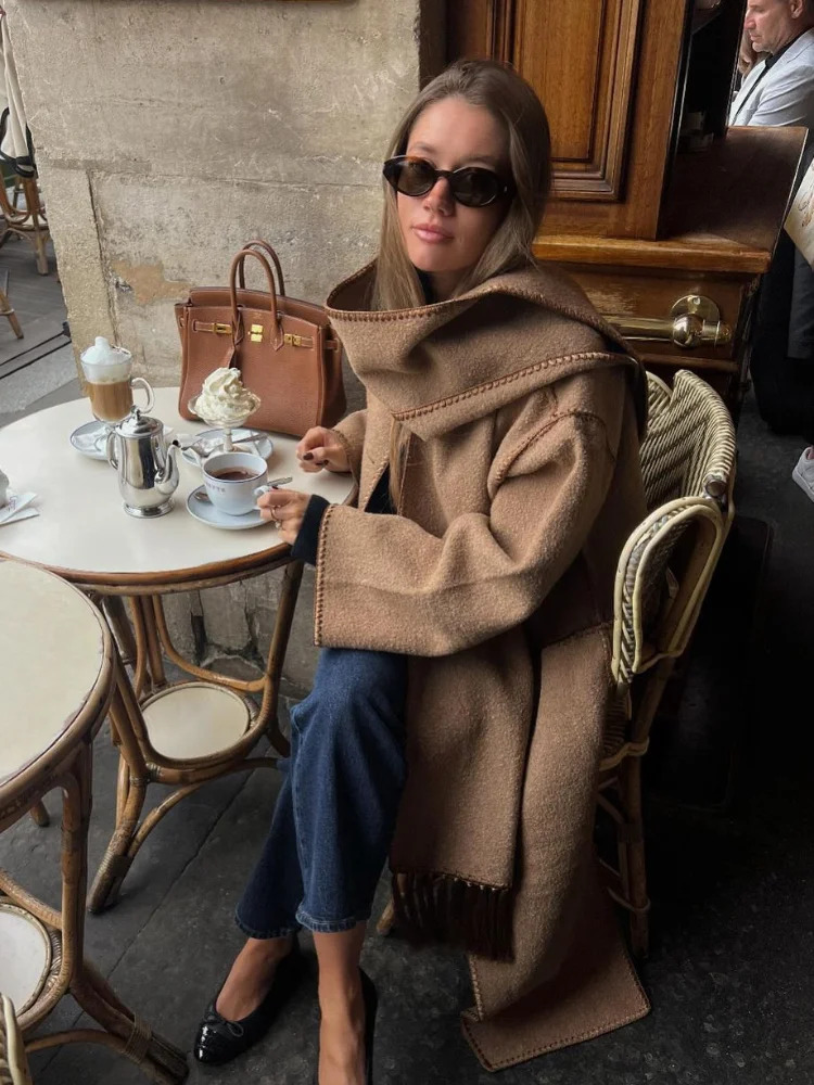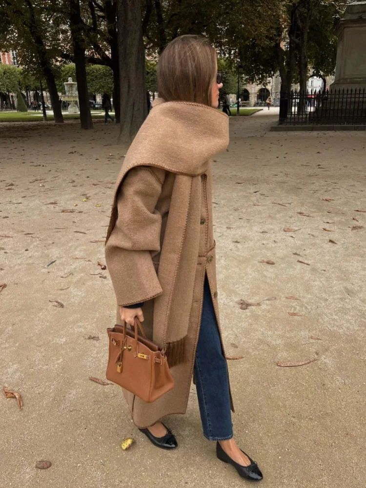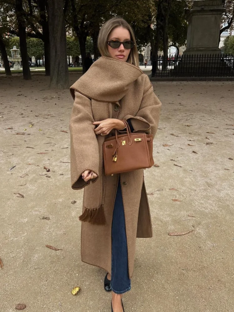 Женское шерстяное пальто, Элегантное однобортное длинное пальто с кисточками и воротником-шарфом, 2024