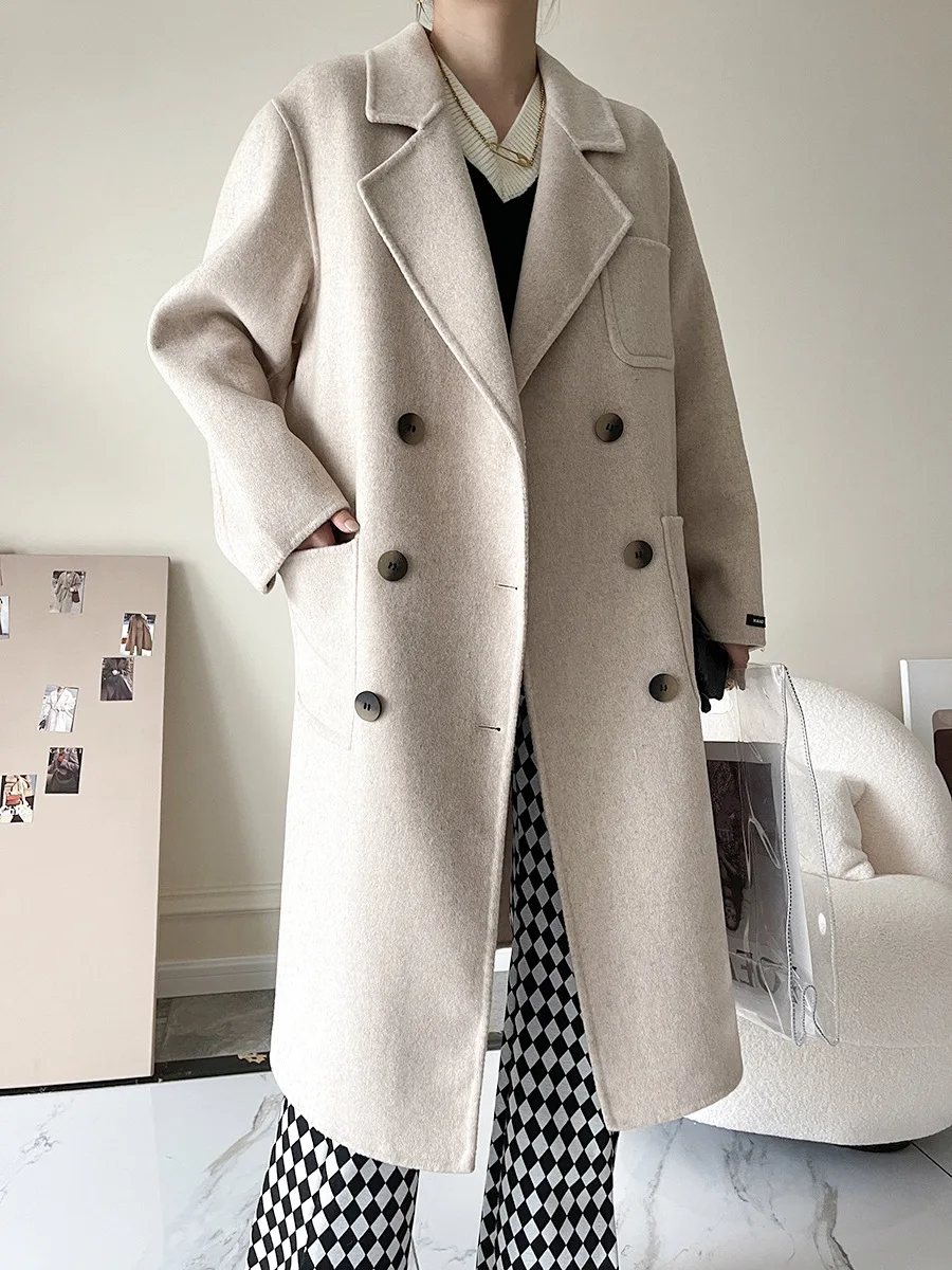 Женское шерстяное пальто, двубортное пальто с длинным рукавом и карманами, длинное шерстяное пальто высокого качества, 2023, осень