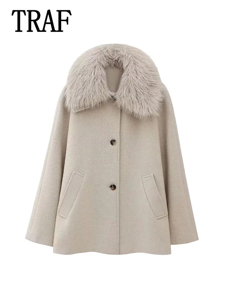 Женское шерстяное пальто с длинным рукавом, с воротником из искусственного меха