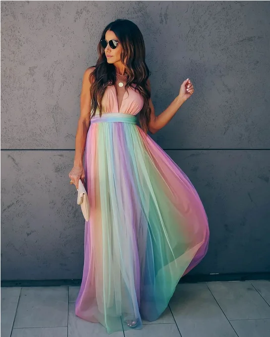 Женское шифоновое платье, длинное Радужное вечернее платье, вечернее платье на день рождения, вечернее платье для выпускного вечера