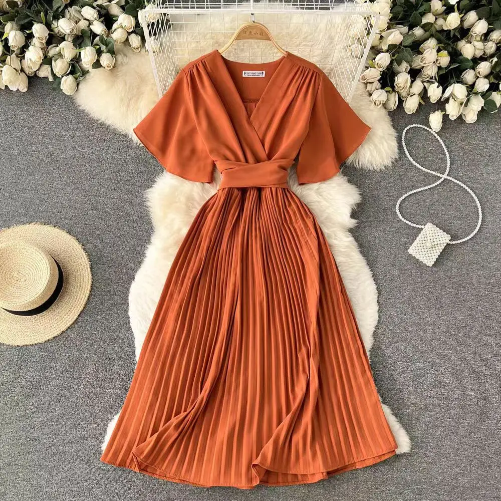 Женское шифоновое платье средней длины, элегантное однотонное Плиссированное офисное платье с V-образным вырезом, поясом и коротким рукаво...