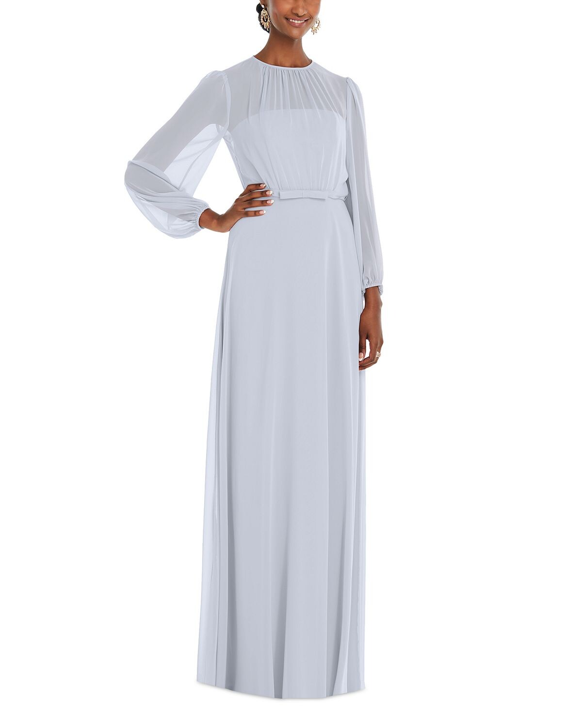 Прозрачные рукава придают элегантный вид этому формальному шифоновому платью из коллекции Dessy.