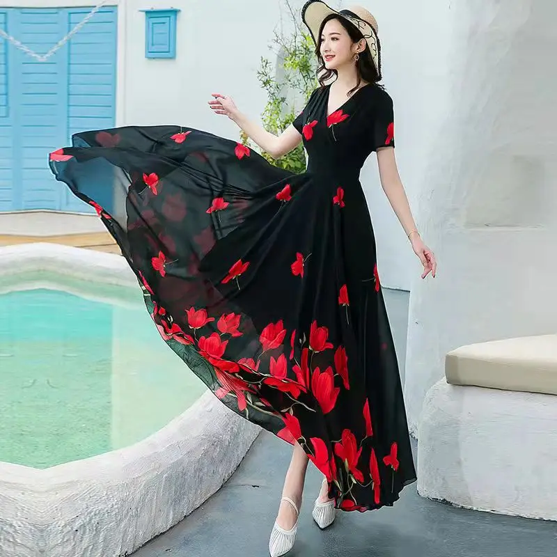 Женское шифоновое платье с цветочным принтом, Черное длинное приталенное пляжное платье в стиле бохо с V-образным вырезом, лето 2022