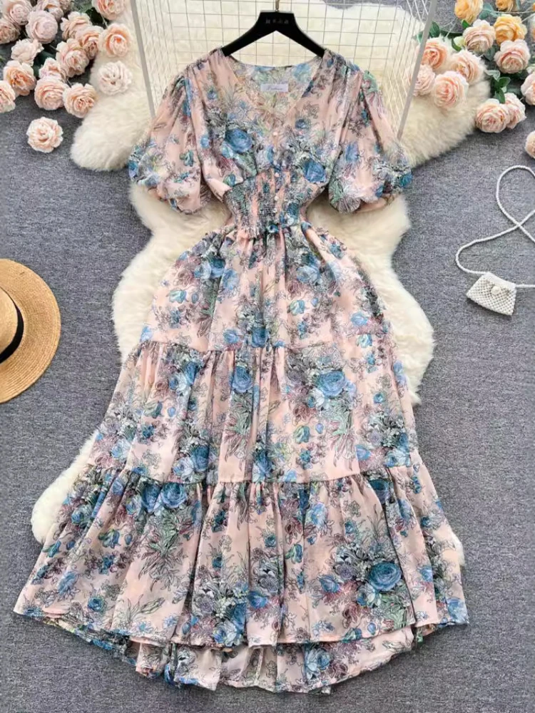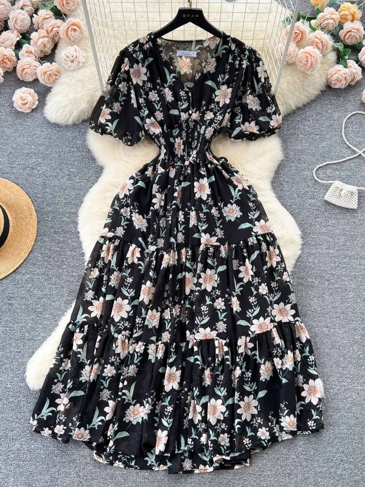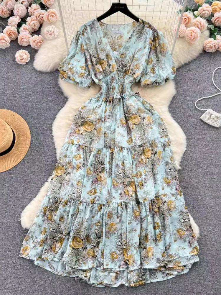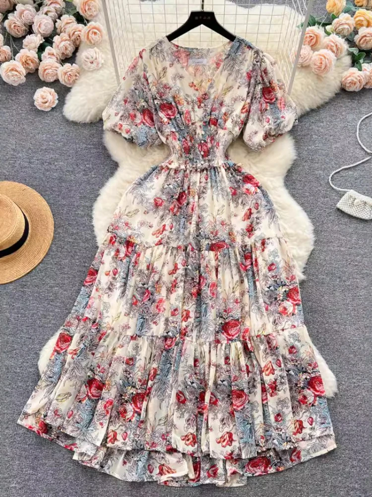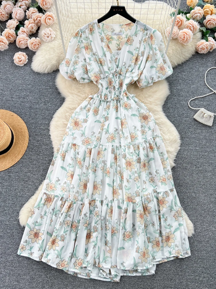 Женское шифоновое платье-трапеция с рукавами-фонариками и V-образным вырезом