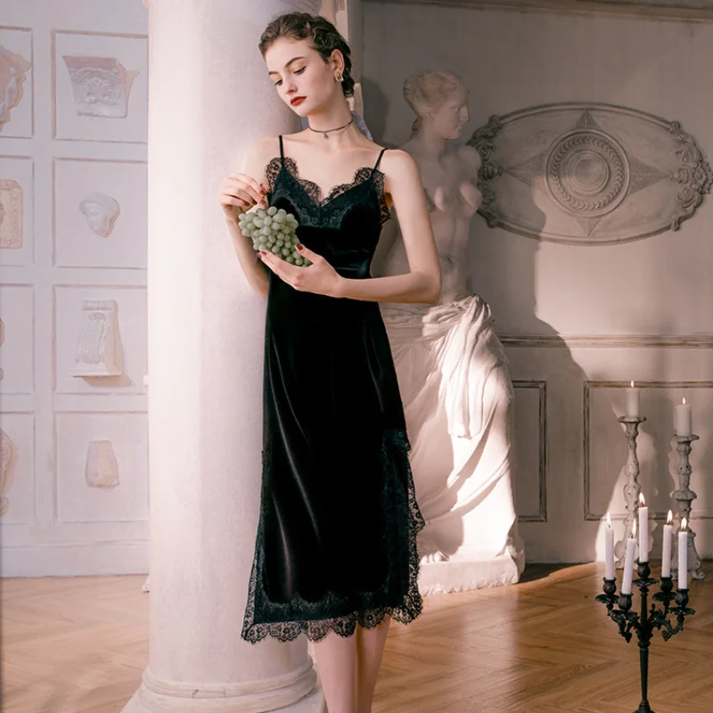 Женское элегантное бархатное платье на бретельках, элегантная длинная ночная рубашка с кружевной строчкой для дома