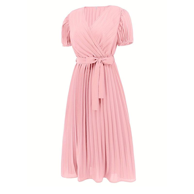 Женское элегантное летнее офисное плиссированное платье с коротким рукавом и V-образным вырезом, сплошной цвет с поясом XL розовый