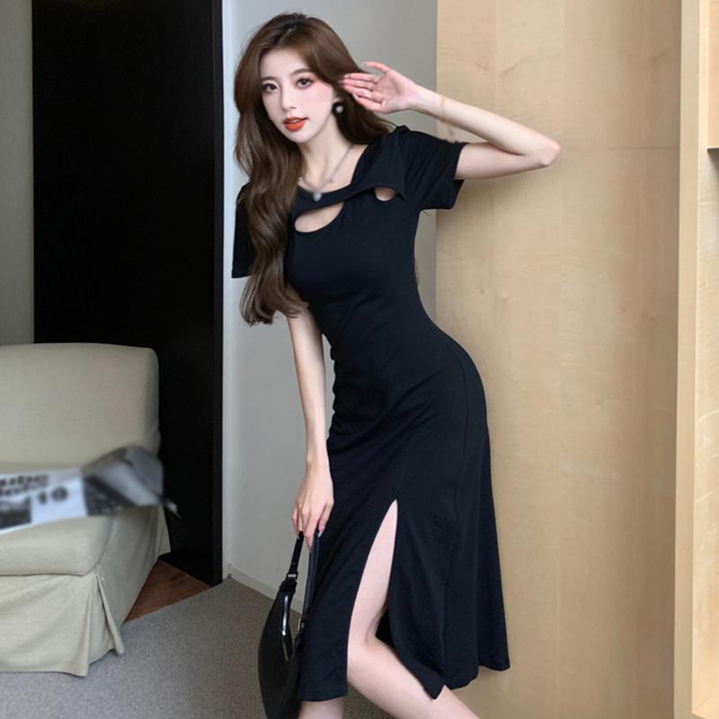 Женское элегантное однотонное тонкое платье с короткими рукавами и нерегулярным круглым вырезом, с вырезом на груди и высоким разрезом, платье средней длины L