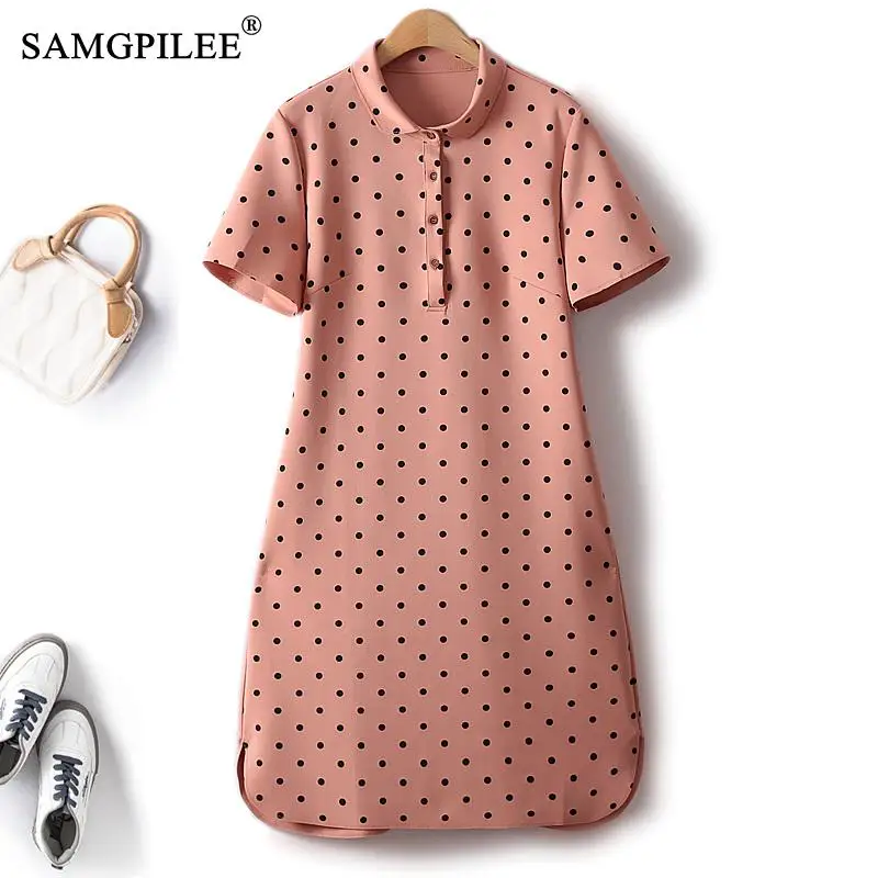 Женское элегантное платье в горошек, свободное повседневное хлопковое платье средней длины с отложным воротником и коротким рукавом, 2023