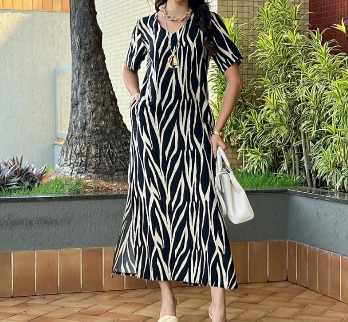 Женское элегантное платье с принтом, V-образным вырезом и коротким рукавом