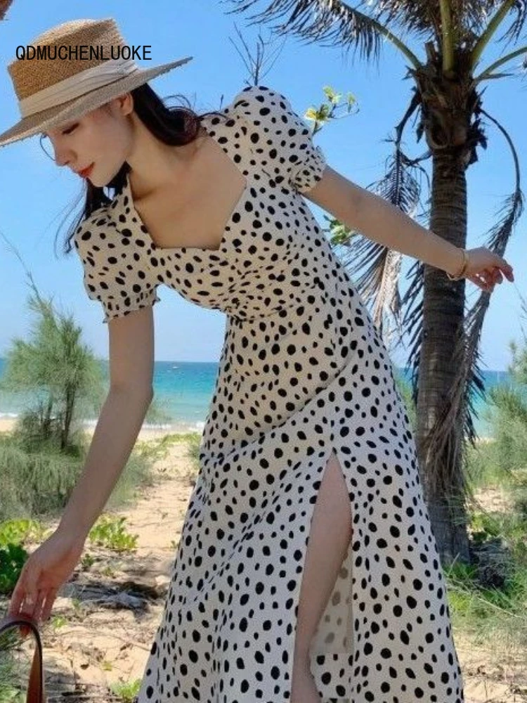 Женское элегантное платье с разрезом, белое платье с цветочным принтом и квадратным вырезом, весна-лето 2023