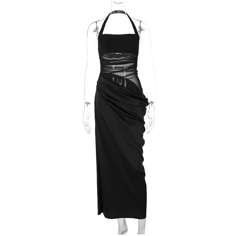 Женское элегантное сетчатое пэчворк-платье с оборками, нерегулярное, однотонное, вечернее платье 2025 года, весна-лето, халтер, открытая спина, ажурные вечерние платья M