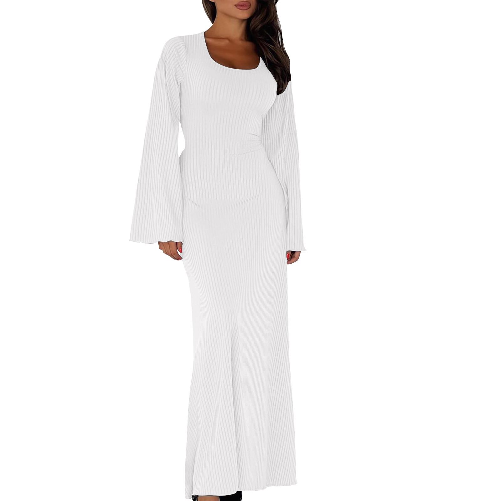 Женское элегантное трикотажное платье с завязкой на талии, платье макси с роговыми рукавами для женщин, однотонное длинное платье с U-образным вырезом, облегающее осеннее платье в рубчик S белый
