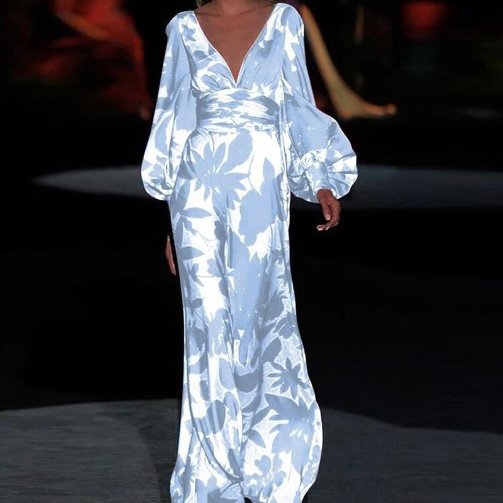 Женщины Свадебные невесты подружки невесты Элегантный V-образный вырез Длинные рукава Цветочный принт Макси Длинное платье вечернее бальное платье L синий