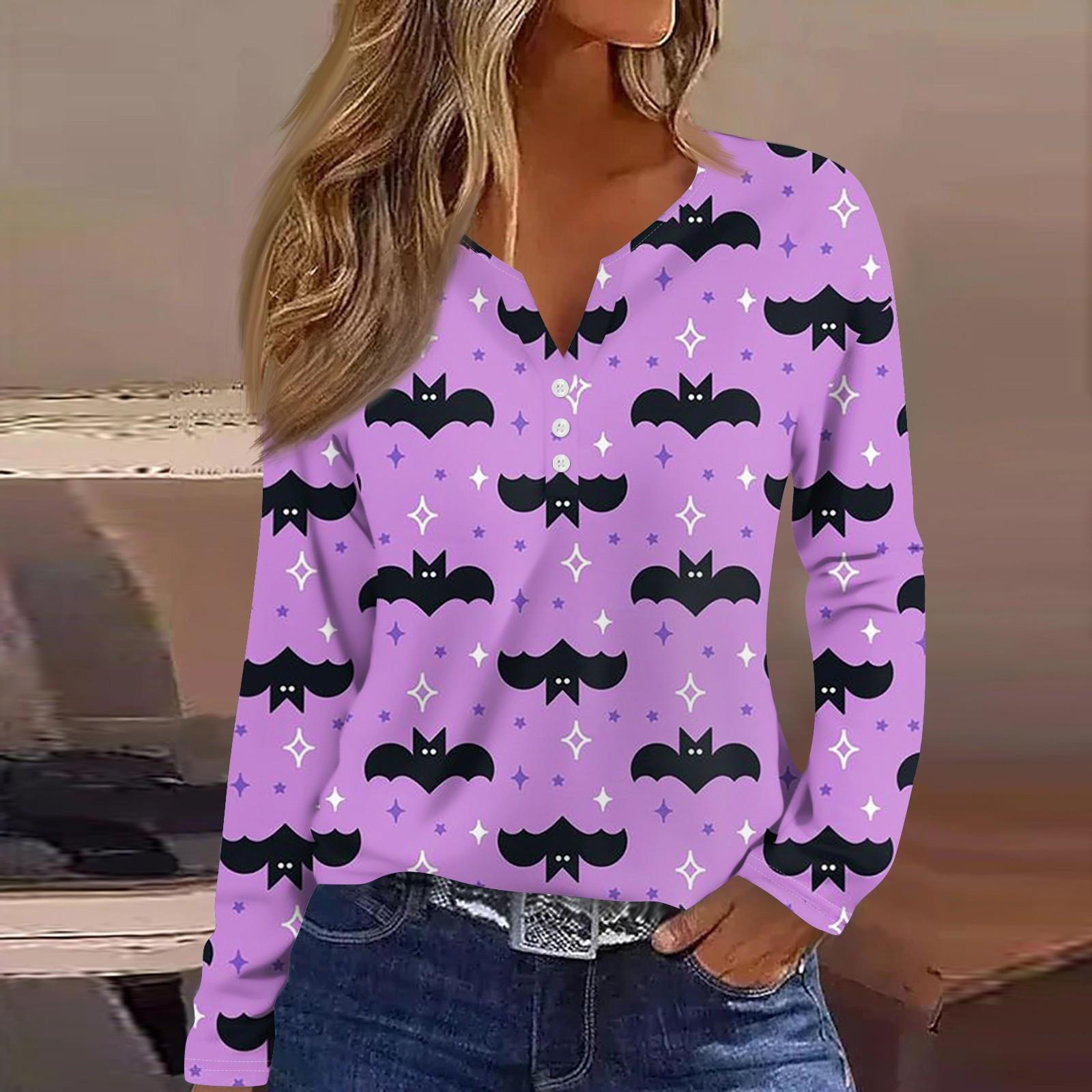 Жен. Футболка Футболка Пуговицы Хэллоуин С принтом Длинный рукав Повседневные Выходные Мода Классический Классический V-образный вырез Обычный Топ L