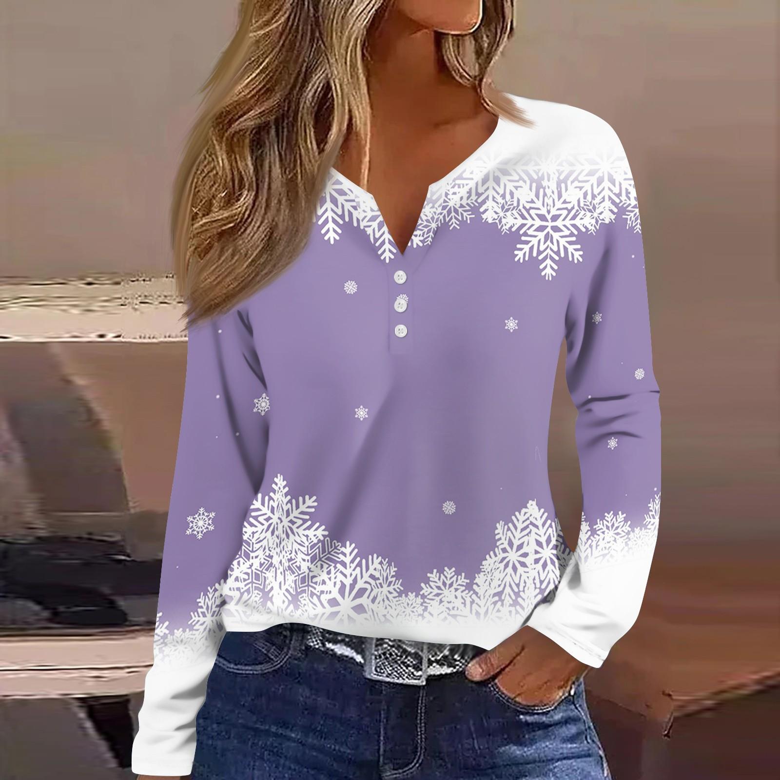 Жен. Футболка Футболка С принтом Пуговицы Длинный рукав Повседневные Выходные Мода Классический V-образный вырез Обычный Верх L фиолетовый