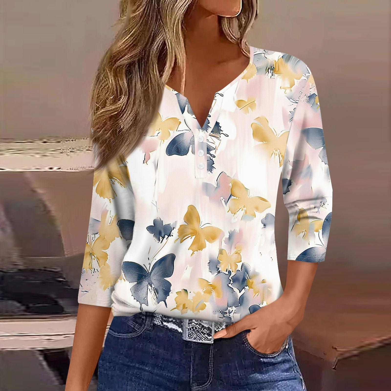 Жен. Футболка Футболка С принтом Пуговицы Рукав 3/4 Повседневные Выходные Мода Классический Классический V-образный вырез Обычный Верх L бежевый