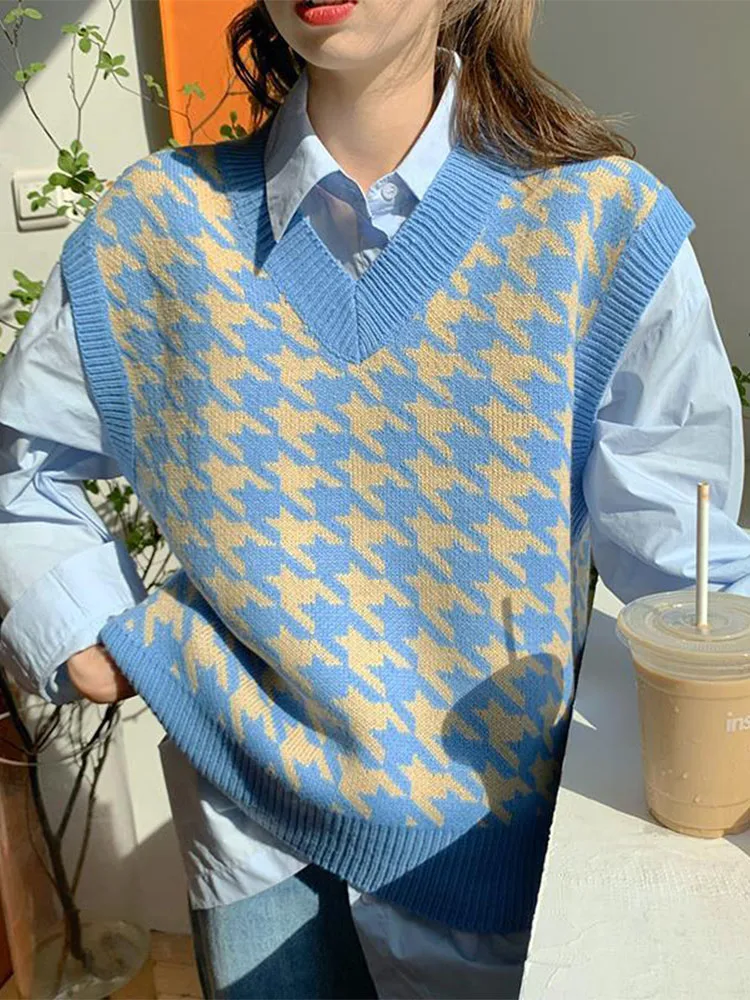 Жилет женский вязаный в стиле «гусиные лапки» с V-образным вырезом