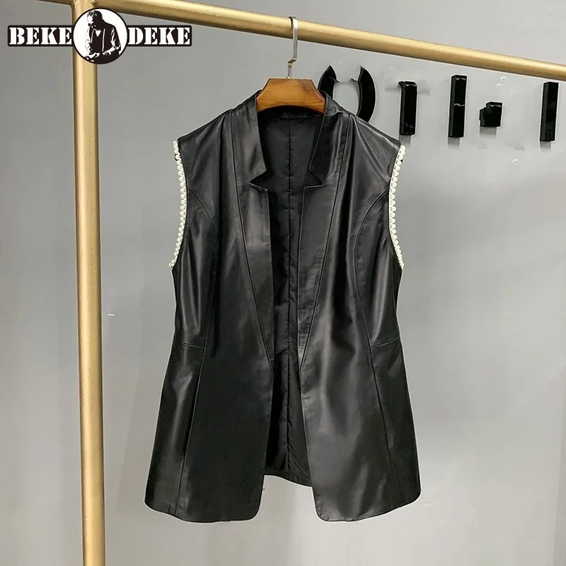 Жилет женский из натуральной кожи, элегантный облегающий офисный жилет без рукавов, с жемчужным бисером и V-образным вырезом, пальто из овчи...