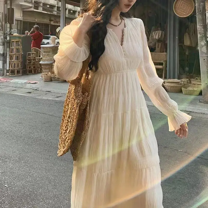 Hanchen Hanchen Spring French Vintage Midi Dress Women Long Sleeve V-Neck One Piece Dress Korean Fashion Outwear Elegant Casual