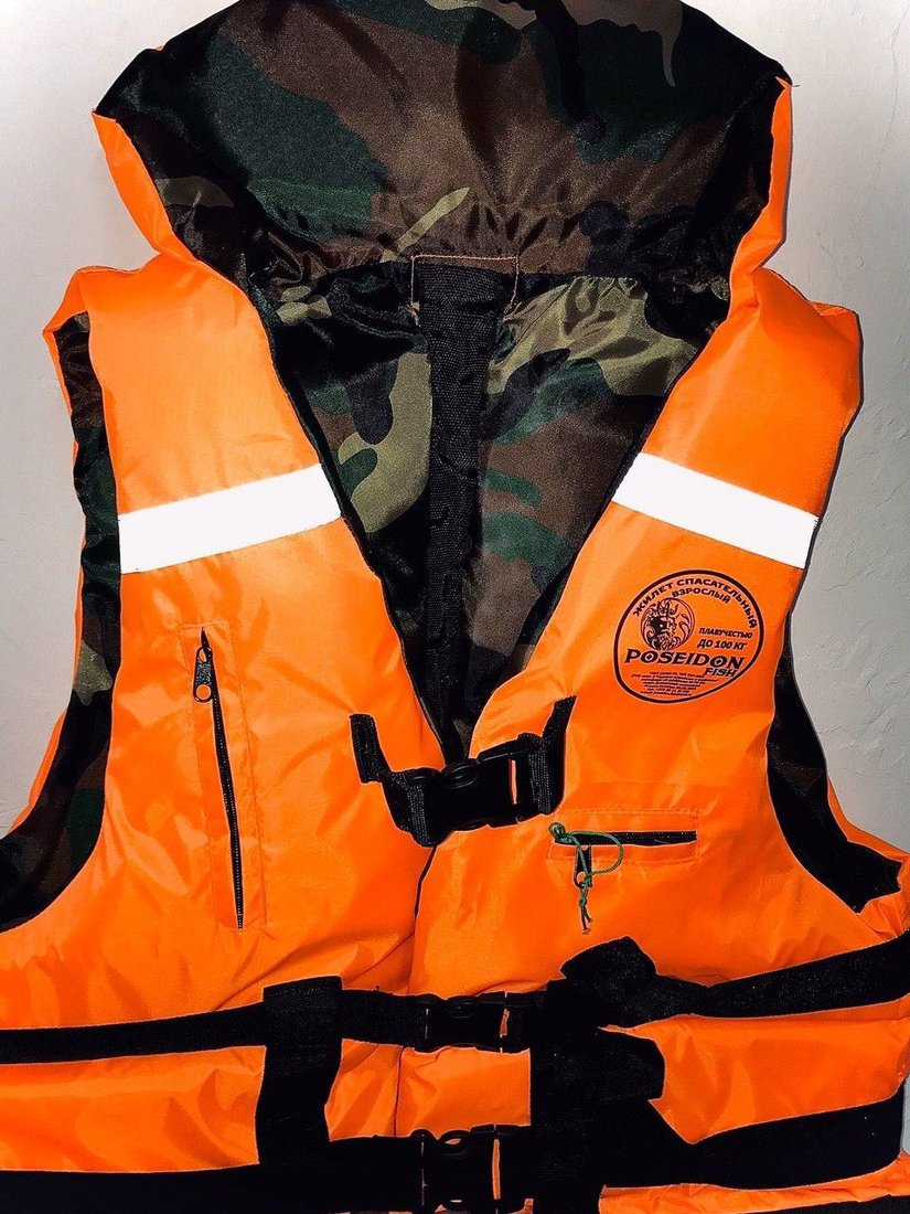 Жилет спасательный Poseidon Fish двухсторонний до 65 кг (оранжевый/камуфляж)